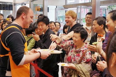 ?????? 揭牌仪式结束后,来自复旦大学、上海财经大学的留学生与第一食品的团员青年们共同呈现了一场精彩纷呈的厨艺比拼活动,中、印、意、韩四道各具特色的菜肴获得了现场评委和观众的一致肯定,通过现场点评和投票,来自第一食品中环店的何晓雯和意大利留学生皮尔杰组合获得了最终胜利。