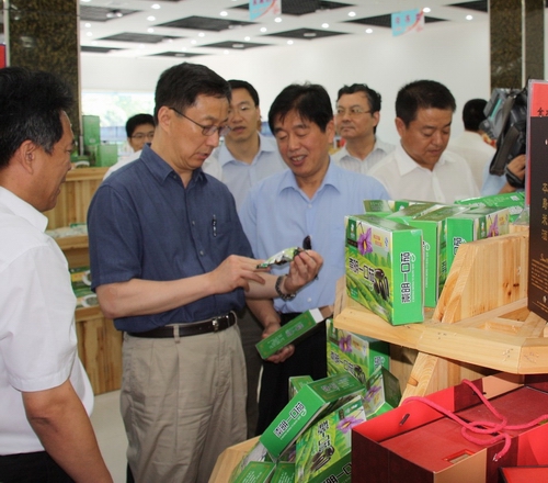 (韩正市长、胡延照副市长在视察跃进“自然之子”崇明土特产产品)