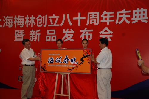 上海梅林创立80周年庆典暨新品发布会于7月26日下午在上海国际会议中心隆重举行,全国政协常委、中国轻工业联合会副会长潘蓓蕾,市人大副主任胡炜出席。出席庆典的还有:上海市经信委主任王坚、中国罐头协会理事长梁仲康、上海市会展行业协会会长吴承璘、市出入境检疫局副局长卢钟山、上海市工业经济联合会副会长胡云芳。光明食品集团监事会主席崔志仁,总裁曹树民,集团党委副书记周海鸣,副总裁张永泉、财务总监曹晓风、纪委书记张大鸣以及上海益民食品一厂集团党政领导、光明食品集团总部部室负责人等。?