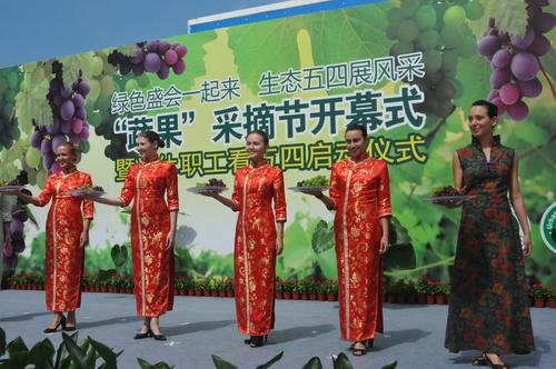 今年夏天,上海市民市郊休闲观光又有了一个好去处,从7月20日起,您可带着家人和亲朋好友,到地处奉贤海湾旅游景区的“上海世博优质果品特供基地”、被“中国国际品牌发展协会”推荐为“中国著名品牌”的上海农工商现代农业园区内的300亩“心心”牌有机葡萄生产基地,感受“采菊东篱下,悠然见南山”的仙境,充分享受“百分百”的营养、健康与快乐。为此,上海市农委副主任殷欧以及光明食品集团、奉贤区、海湾镇等有关部门的领导,出席并为由光明食品集团上海五四有限公司主办,上海都市农商社承办的《绿色盛会一起来、生态五四展风采》为主题的“蔬果采摘节”系列活动开幕式剪彩。国际礼仪小姐为现场来宾绘声绘色的展现了各种有机蔬果,应邀前来国外高级名厨现场制作生态健康、清香可口的蔬果菜式,让参加活动市民游客和246名五四退休职工代表品尝之余赞不绝口。