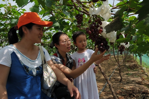 (市民们纷纷到果蔬园里采摘葡萄)