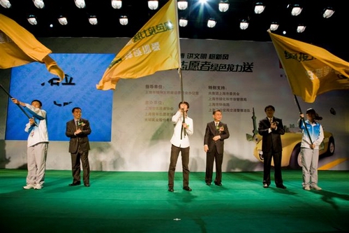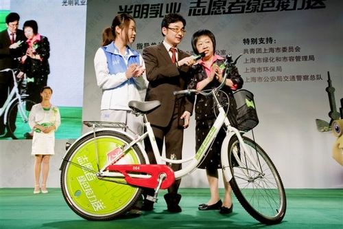 ??? 市委宣传部副部长、市文明办主任马春雷同志和志愿者代表、私家车主代表共同启动“志愿者绿色接力送”活动;上海志愿者协会会长、世博志愿者组副组长陈振民、光明集团总裁曹树民和光明乳业总裁郭本恒为绿色接力送志愿者服务队授旗;光明食品集团党委副书记周海鸣向城市志愿服务站点志愿者捐赠自行车;上海市公安局副局长朱伟明向参与活动的私家车主代表赠送绿色接力送活动车主培训手册;市环保局党委副书记姜南为获“绿色之星”的称号的环保志愿者颁奖;光明食品集团副总裁兼光明乳业董事长庄国蔚致欢迎辞;光明乳业总裁郭本恒介绍《绿色接力送》活动的概况;光明乳业副总裁李柯向曹阳小学捐赠环保椅。