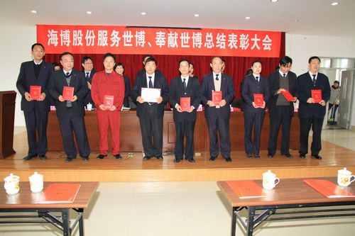 海博股份副总裁谢云在大会上宣读了《关于表彰服务世博、奉献世博先进集体和先进个人的决定》,在此次服务世博中,海博股份有9个集体和81人次被评为上海市各级先进集体和先进个人,海博股份还评选出16 个先进集体和 370 名先进个人。股份公司领导洪明德、汤玉萍为荣获上海市世博先进集体称号的海博世博车队和海博租赁世博服务车队颁发了奖牌。