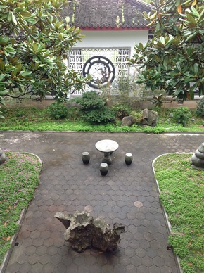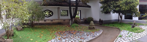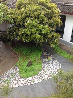 这次主要的改动则在西别院内,原本一块方寸之地只以一条弯道来分割2块绿地,道路与绿化也无很明显的江南古典园林风格,园林是门综合艺术,深受中国哲学、诗文、绘画等影响,中国传统文化中“天人合一”、“壶中天地”的审美观念使我国的古典园林重视人与自然的和谐,重视意境的营造,所以设计师在原来大面积草坪上营造了一条蜿蜒的青砖路,路边遍植小竹,甚至在青砖路上也预留了4个种植穴,让青竹点缀在路间,有了小径,就可以让人去亲近自然,打破原来大片草地和草本花卉的园子却没有一条小径通向其间,难以走近植物,亲近园林的弊端,除了青砖小径,在大面积的草地上额外做了2块大小不一的碎拼石板平台,平台的作用不但缓和了原来道路生硬分割的两边绿地的粗糙感,同时也暗合中国传统“阴阳”调和的文化理念,稍大的平台也把庭院中的一株高大的金桂与一块造型绮丽的太湖石凸显出来,造成一种树与石之间的对话关系,亦成一景,而原本这些树石都湮没在大面积的草丛之中,而现在只需简单的分割和调理这院中的气场,一种阴阳和合之美立即体现出来,稍小的平台镶嵌在绿地中,犹如一座“龟岛”,蜿蜒柔和的边线,使得周围的绿地犹如一汪春水,虽然这方庭院不大,但植物、山石、小径、假想的水池和绿岛都有了体现,景观的组合也体现“负阴抱阳”的和谐理念。这些碎拼石板平台的设置,设计师这样做的目的是考虑到庭院内的厢房是人生博物馆,提供这样一条小道和平台,也可供游客在参观完博物馆后,在庭院中休憩片刻,提供一个给游客观后思考和回味的场所。