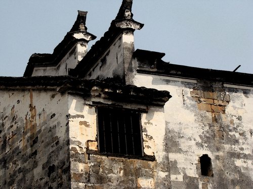 ??????? 它的美,美在它的古建筑。49年前,婺源还属于安徽,所以当地留下的古建筑都具有徽州建筑的特点。婺源的民居,黑瓦白墙,马头翘角,色彩典雅大方。给人留下深刻印象的是那屋顶上的马头墙,也称风火墙。据说风火墙有两大功效:一是傍边的屋宅一旦失火,可以起到隔断火源的作用;二是象征意义,那风火墙头的造型,象是急切盼望丈夫归家的妻子。除此以外,徽民居还有两个特点,一是窗户很小,有些墙面就根本没窗。据说是因为夫君一般都外出,女子在家以免春光外泄。为解决窗户狭小而带来的采光不足问题,随之而来的就有了有别于其他建筑的----厅堂前的天井,算作为不是窗户的窗户。一下雨,雨会通过这通天“窗户”的瓦沿滴落在堂前的家里。当然下面有接水的水池,再通过下水道排到外面。美名曰:肥水不流外人田。