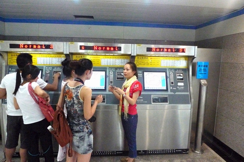 图为农房世博轨交志愿者帮助乘客购买地铁票