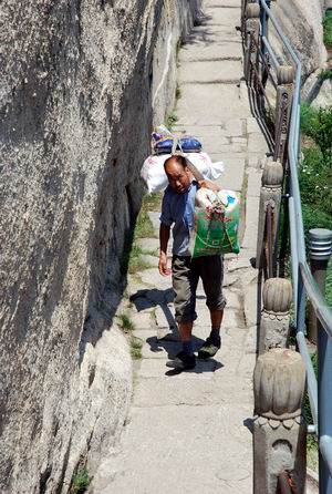 走累了,我们靠着铁栏杆喘息着,一个挑夫从我们面前走过。他穿着一件洗得有点发白的蓝褂,身后的汗水,又把发白了的衣服染成了深色,他的裤脚卷到膝盖处,穿着一双很旧的解放鞋。两头捆绑着两袋大米的硬木扁担,沉重的压在他的肩膀上。他不时的抬头,看一眼似乎总也走不完的台阶,一步一喘的向上攀登着。在他的身后,留下的是一串尊敬的目光。我真想让他停下来,喝口水,休息一会,陪他说会话。我不知道他一天会有几个上下来回,也不知道他这一趟上下会有几多收入,但我知道,这就是他的生活,这就是他的生活态度,坚定,沉稳,不屈不饶,就象华山岩石间顽强生长着的松树。望着他渐渐远去,阳光下,他的身影被放的很大,很大。