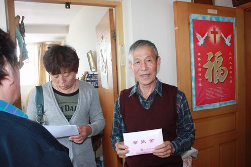 (上海农场社区负责人以及事务受理中心工作人员向困难职工赵国安送上慰问金)