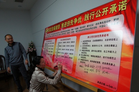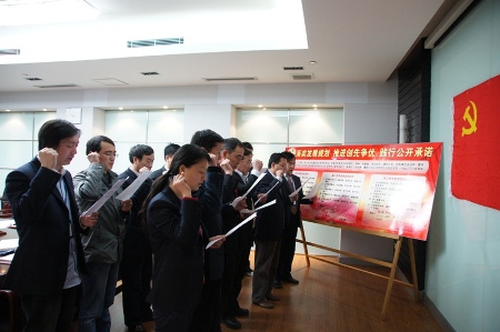 4月12日,烟糖集团总部还以党支部为单位,举行了党员创先争优承诺活动。公开承诺是推进创先争优活动的重要载体,是党员立足岗位、促进发展的“责任书”,是改进作风、服务群众的“保证书”,是争当先锋、彰显先进的“宣言书”。总部全体党员在党旗下庄重宣读并签署了承诺书。党员们的诺言语句精简,意义深远,情感真切,表达了每一名党员自我加压,扎实工作,自觉接受群众监督,把承诺铭记在心中,落实在行动,为实现集团发展而努力的决心。 ?。ㄑ衔皹?文??薛建国/摄)
