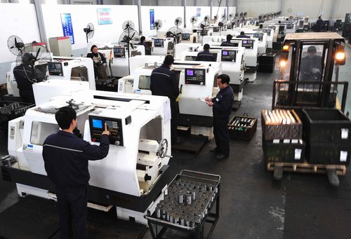 (申光公司数控车间工人正在精密的生产设备旁生产风电产品)