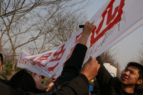 (?团员青年在植树横幅上签字表决心)