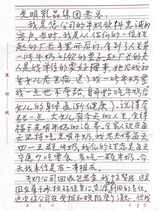陆老先生的这封手写信,寥寥数百字,却道尽了一位老人对光明乳业这一老字号的信赖和期待。信中写到,早在几十年前,陆老先生的长女诞生,从小体弱多病。当时,陆老先生一位同事的丈夫恰好在光明乳业工作,想方设法为陆老先生争取到一张牛奶票。从此,每天一瓶光明鲜奶开始陪伴陆老先生的长女成长。“我一点也不夸张,自开始吃牛奶后,女儿的身体逐渐健康了?!闭饧仁且晃桓盖锥耘畛恋陌?,也是一位消费者对光明品牌深深的信赖——因为女儿的缘故,每天喝光明牛奶,已经成为陆老先生一家几十年的习惯。