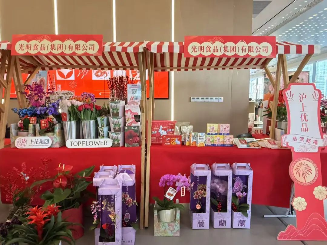 光明好选推出“光明味”的新春礼包,第一食品带来“果然好”新春坚果礼盒,光明乳业带来“光明优加”有机纯牛奶系列新品,“玉棠”“金枫”“汪裕泰”“光明玖壹玖”等品牌带来多款茶饮、酒饮,花卉集团精心设计布置巨型花卉,蔬菜集团携来自云南、新疆等地的优质农特产品亮相集市,营造出浓厚的新春氛围。