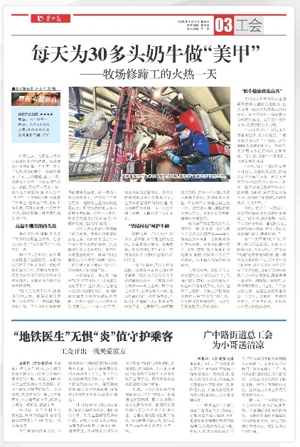 2025年7月6日,《劳动报》记者来到光明金山牧场,在高温牛棚里,实地探访了“奶牛美甲师”邵长亮的一天,并以《每天为30多头奶牛做“美甲”——37℃,牧场修蹄工的火热一天》为题,专题报道了光明乳业牧场内的工作者辛勤呵护牛蹄,让每头牛健康成长,从源头保障光明好奶源的光明故事。