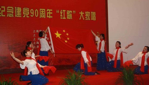 6月15日,海丰社区文体中心内歌声嘹亮、气氛热烈。为了纪念中国共产党90周年华诞,海丰建设服务公司、宝山光明社区卫生服务中心、海丰学校、海丰派出所和海丰社区5家共建单位联合举办《纪念建党90周年“红歌大家唱”》文艺活动。