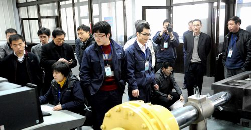 (与会专家和代表正在技术中心现场观摩M36和M39预浸涂干膜自润滑螺栓连接副扭矩系数试验)
