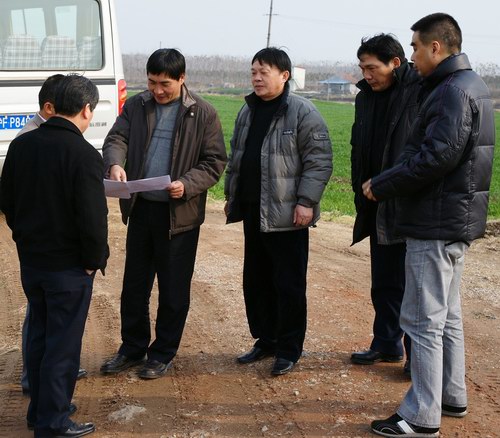 (市农科院副院长顾晓君(左三)在跃进指导杂交粳稻制繁种基地建设工作)