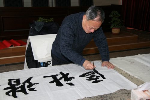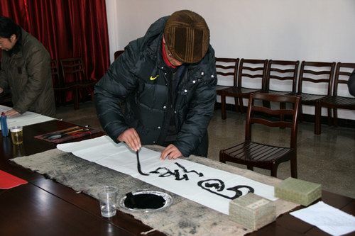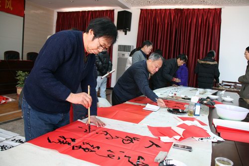短暂的会议之后,书法大师们便大挥笔墨,各显风采,以上农文化为主题,围绕我场的新三年发展规划,为农场送上了一幅又一幅的意义颇深的作品。在社区居民的强烈恳求下,大师们还给居民送上了一副副亲自创作的对联。一幅幅字画,一副副对联,不仅体现了大师们高深的艺术创作水品,更体现了农场与大丰文艺界之间的深厚友谊。以后将更多的开展这样的文化交流活动,丰富上农居民的精神文化生活,为上农文化增添更多的风采。 (薛成? 图/文)