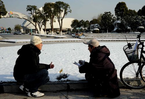 (鲜花港科技人员在盛彩广场检查雪被下面的种球时兴奋地说:“瑞雪兆丰年啊”。)