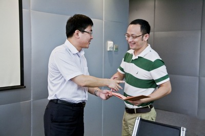 (光明乳业公司党委书记夏旭升向监督员发聘任书)