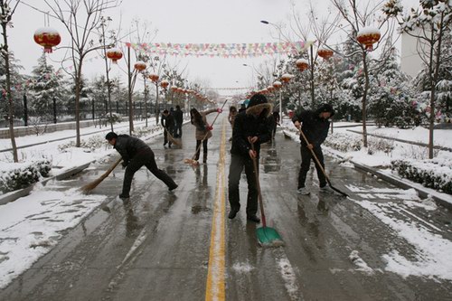 ![]() (“小蜜蜂”青年志愿者在扫除社区主干道积雪)