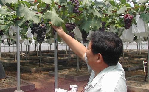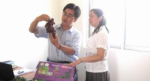 (五四都市农商社技术人员在认真研究 “富硒有机葡萄”果型品质)