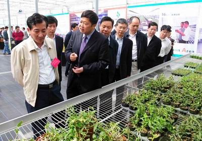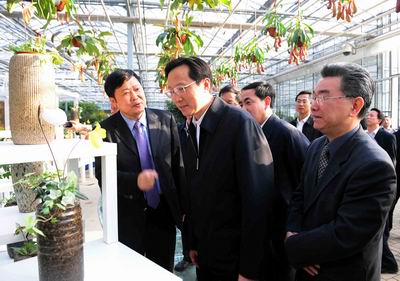 国家农业部副部长陈晓华(左)在上海市副市长姜平,浦东新区区长姜梁,市府副秘书长王伟,光明食品集团纪委书记张大鸣等陪同下,考察上海鲜花港内展示的云南石斛展区。