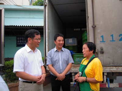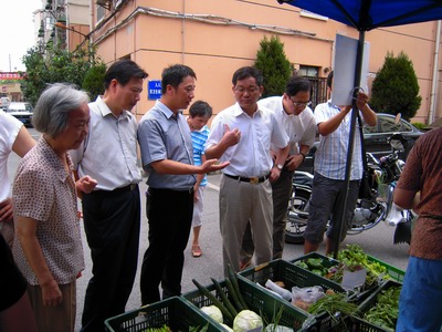 8月30日上午,上海市农委主任孙雷在市蔬菜办主任陈德明等领导的陪同下,考察了位于长宁区刘一社区的五四有限公司“都市菜园”社区销售点。