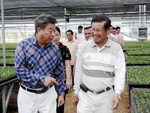 (老挝副总理宋沙瓦(右)等一行在张世定总裁陪同下视察云南石斛生产基地)
