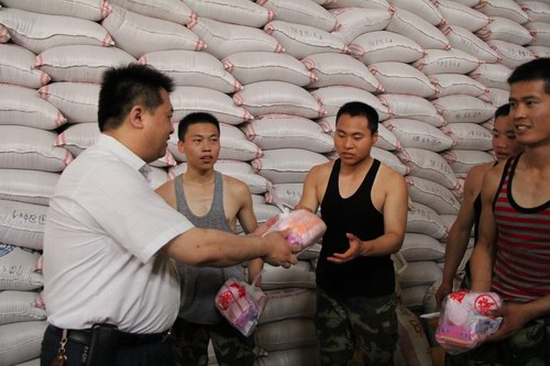 在清晨凉爽的风中,上海武警支队十名官兵在班长的带领下参与紧张而忙碌的“三夏”工作,他们用实际行动展现了对企业的支持、对民生的关心。川东农场党委书记朱航明、场长田广荣来到仓储中心为他们送去了亲切的问候,并代表农场党委及所有员工向武警支队的援助表示最衷心的感谢。