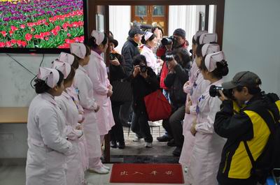 在拍摄过程中摄影家们一方面与医院工作人员交流专业的摄影技术,另一方面医院的规模以及老人们在这里安享晚年的场景让身为同龄人的他们感叹、羡慕。甚至在观看医院护士操作表演时,还有几个靓女摄影家当场换上了护士服,过了一把当白衣天使的瘾。(张晓娇/文 张立杰/摄)