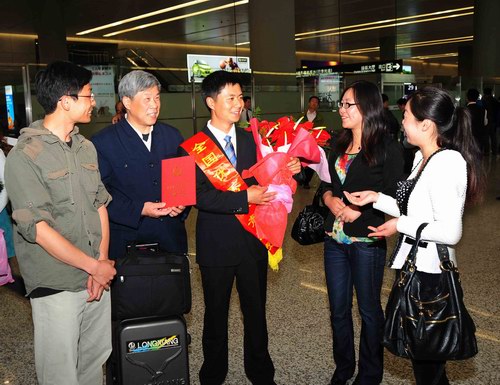 鲜花港党支部书记(左1)及小王的父亲(左2)到虹桥机场迎接。)