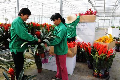 上海鲜花港生产工人正在紧锣密鼓地包装“中国红”凤梨盆花
