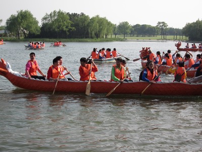 团史定向越野结束之后全体成员马不停蹄的集中在龙舟码头,开始龙舟竞赛。首先教练向我们传授了赛舟技巧:只有大家齐心合力,才能以最快的速度往前行驶。大家穿好救生衣,跃跃欲试,准备进行分组龙舟赛。当我们划着桨在水上行进时,发现划船也不是一件轻松的事,大家一起划,方向难控制,一会左、一会右,只听见队长在船尾不停的喊着:左边用力、右边用力,在队长的指挥下,我们节奏一致,顺利向前划行。当几条龙舟竞争划过狭窄桥洞时,“赛龙舟”俨然变成了“泼水”大战,只见船桨或在船与船的夹缝中“挣扎生存”,或在空中挥舞,俨然成了“洒水”工具。水面上水花一片,尖叫一阵,不亦乐乎!龙舟竞赛结束之后,大家虽然全身湿透,但是每个人都感受到了团队合作的意义和共同迎接挑战的乐趣。