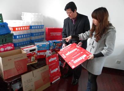 (五四有限公司“方信包装”管理人员正在检验包装产品质量)