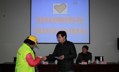 3月1日,海丰青年志愿者服务队成立暨海丰青年爱心基金会捐款仪式在海丰农场文体活动中心隆重举行,标志着海丰总公司正式有了自己的青年志愿者组织。海丰总公司党政领导、共青团干部、优秀团员青年、社区居民志愿者们共同见证了这一庄严的时刻。